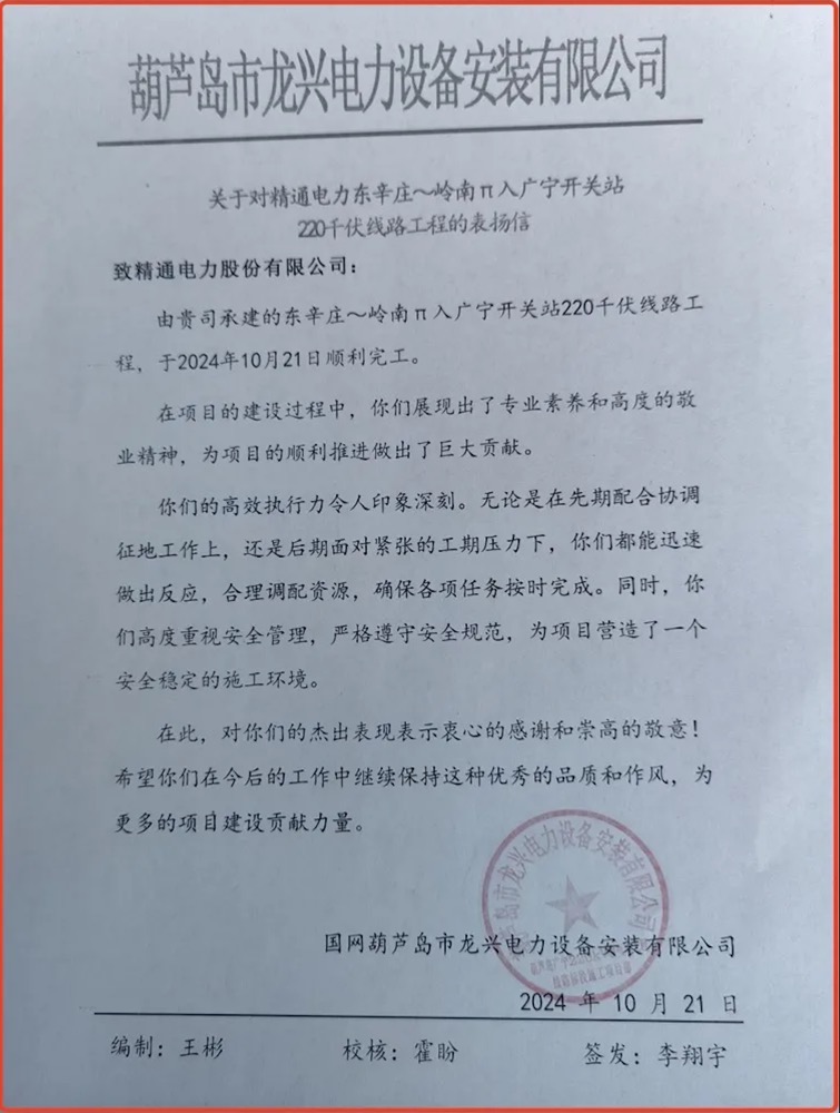 10月21日,國網(wǎng)葫蘆島市龍興電力設(shè)備安裝有限公司對精通電力承建的廣寧開關(guān)站220千伏線路工程中重視安全管理,嚴守安全規(guī)范,為項目營造了安全穩(wěn)定的施工環(huán)境,高效的執(zhí)行力和配合度保障施工進度;提前兩天半完工,為后續(xù)中海油線路接引爭取了寶貴時間。