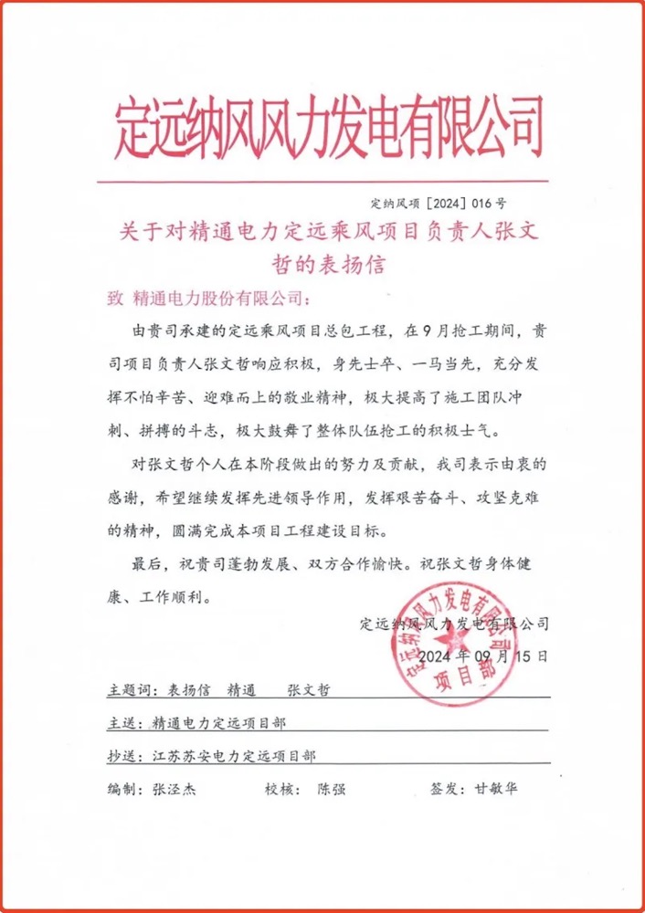 早在10月6日,公司收到定遠納風風力發(fā)電有限公司發(fā)來表揚信,表揚信我司在搶工期階段,項目負責人張文哲積極響應(yīng),不怕辛苦、迎難而上的敬業(yè)精神,圓滿完成搶工期階段的建設(shè)目標。