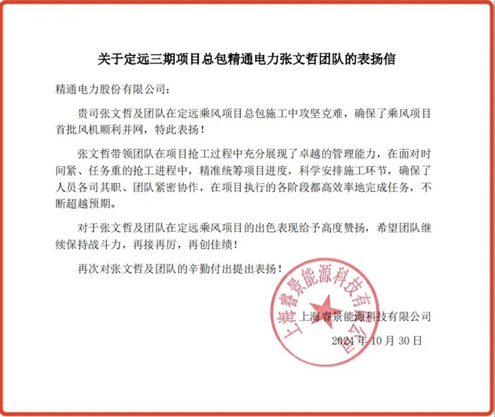 10月30日,精通電力負責的“定遠乘風200MW風電施工總包項目”傳來喜訊:在項目推進過程中,公司憑借卓越的專業(yè)能力和優(yōu)質(zhì)的服務(wù)水平,收到業(yè)主單位上海遠景能源科技有限公司的表揚信,表揚該項目總包施工中攻堅克難,確保乘風項目首批風機順利并網(wǎng)。